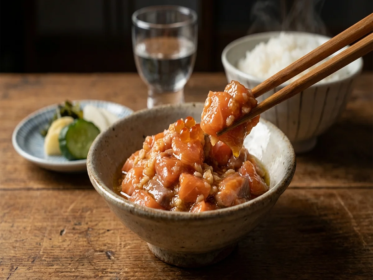 サーモンの塩辛はイカやサーモンハラス、いくらを塩麹で漬け込んだ珍味です。