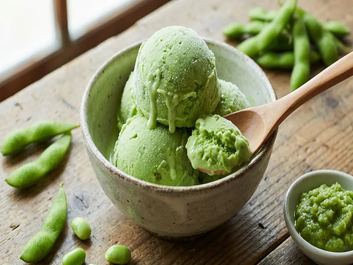 - 砂糖入りホイップクリーム・卵黄・枝豆ペーストを混ぜ合わせる