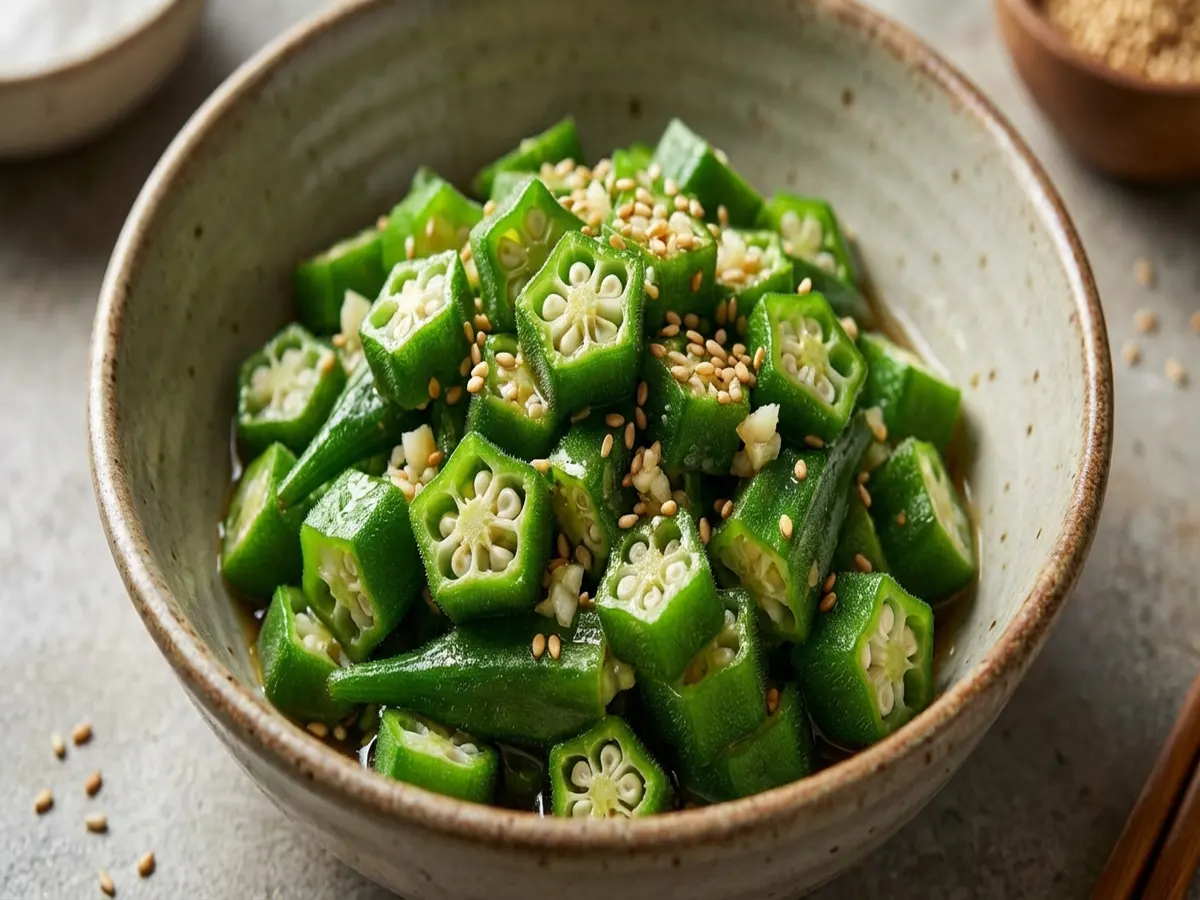• オクラを調味料に和え、最後に炒りゴマを振る