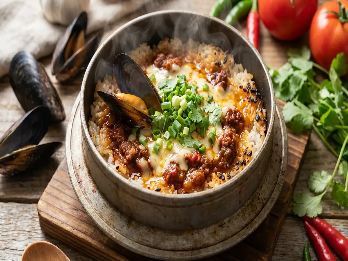 minutes釜1グランプリレシピ「チリマッスル釜飯」です。唐辛子&ムール貝の炊き込みご飯です。