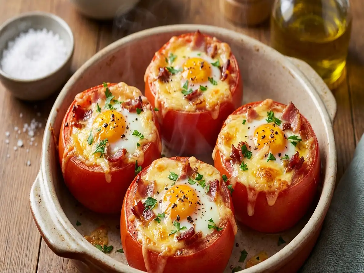 - トマトのくり抜いた中に卵を割り入れ、塩とこしょうをふる。