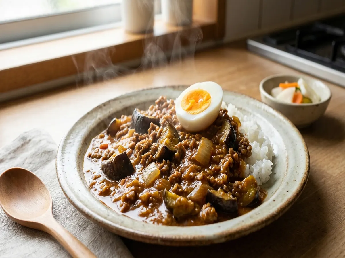 - ご飯を盛ったお皿に6のキーマカレーをかけ、お好みでゆで卵を添える