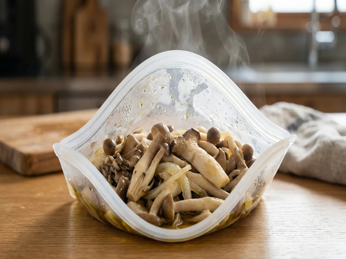 - ほぐしたきのこ・スライス玉ねぎ・お好みのドレッシングをシリコンバッグに入れる