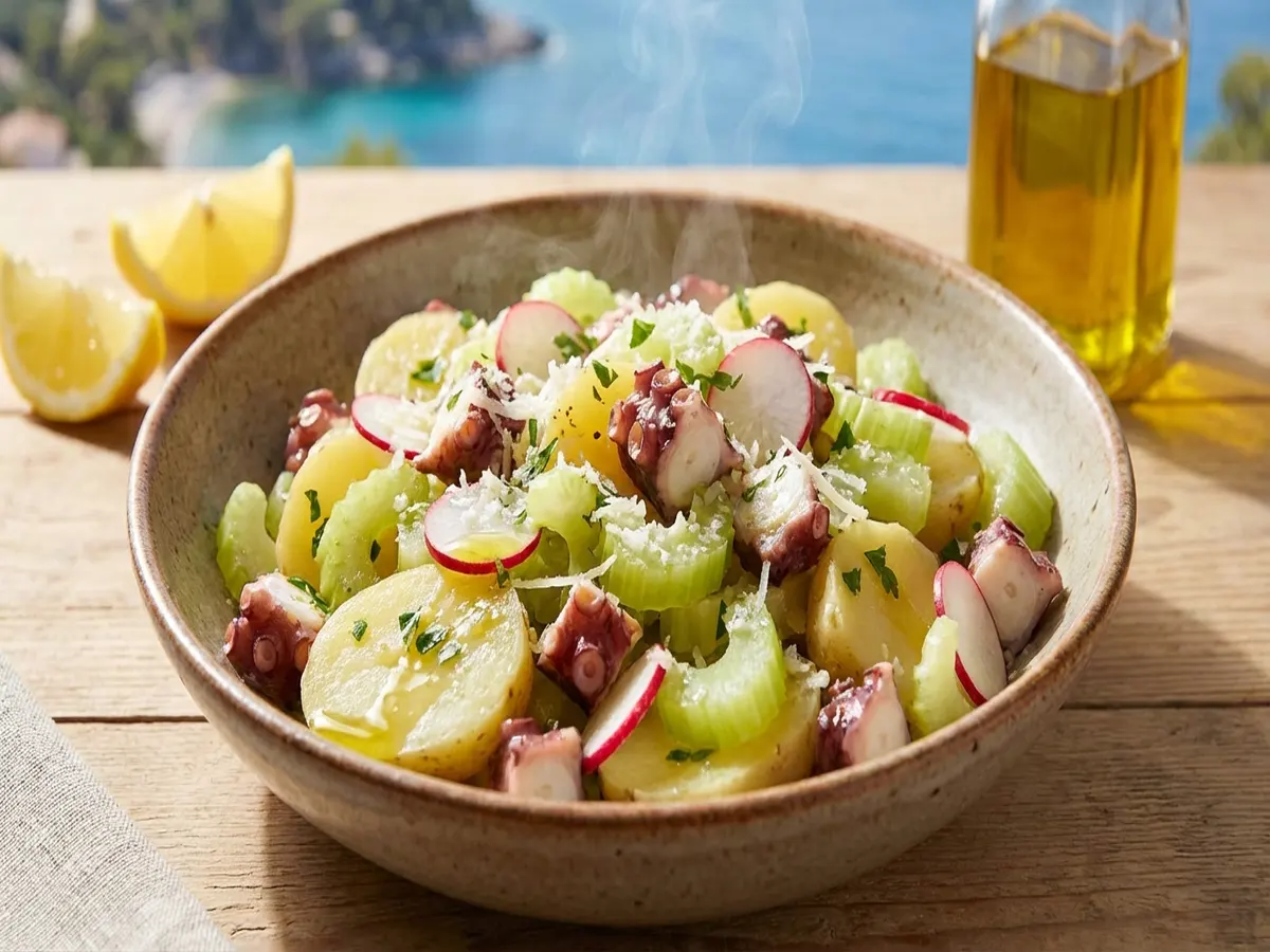 - レモン、粉チーズ、オリーブオイル、茹でたタコ、ラディッシュを加えて和える