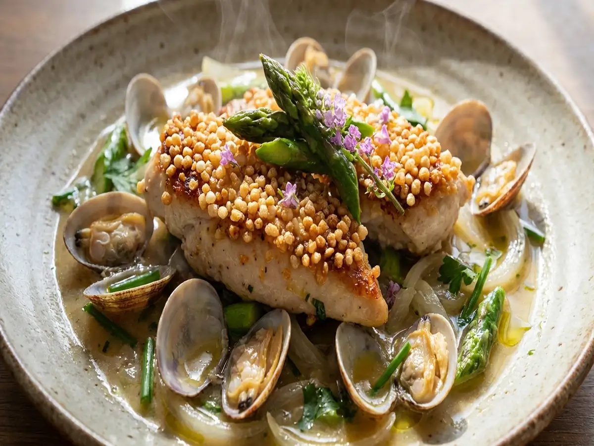 minutesフレンチ渡辺雄一郎さんのレシピ「鶏ささ身のあられソテー オニオンあさりソース」の作り方です。