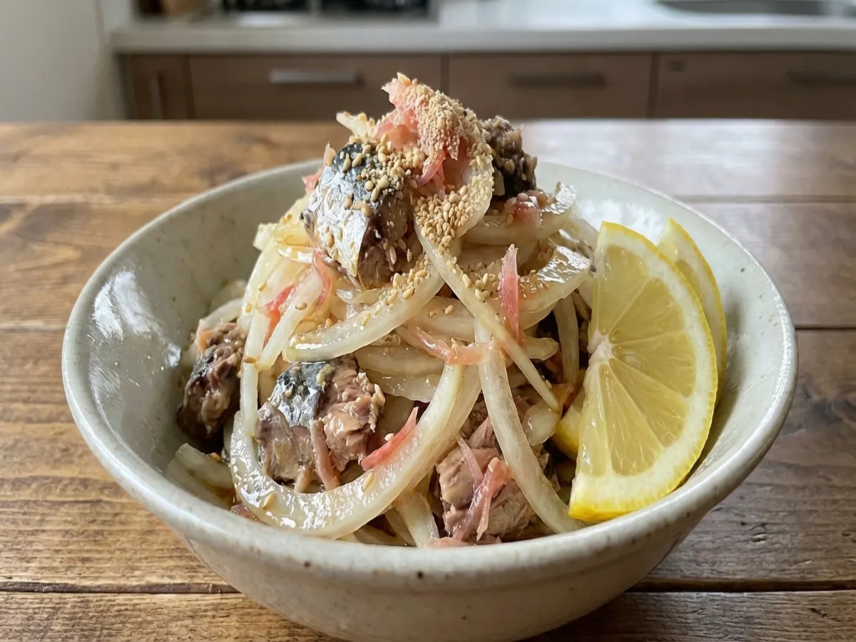 minutes今泉久美さんの新玉ねぎレシピ「サバ缶和え」です。