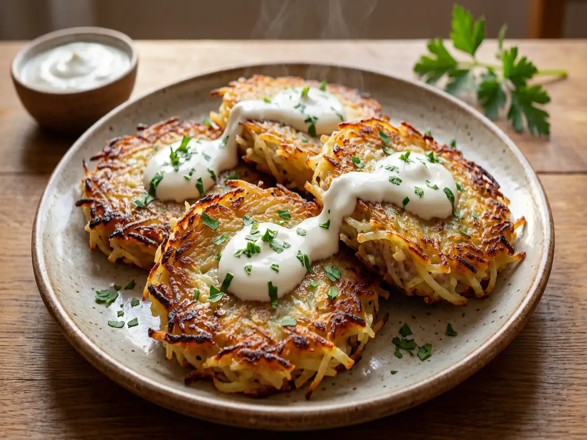 <point>プレーンヨーグルトと生クリームは同量で混ぜる - 肉入りおやき(ドラーニキ)を皿に盛り、サワークリームをかける