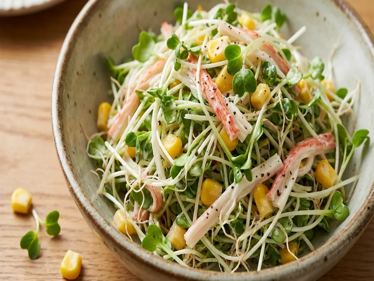<point>根っこごと食べられるスプラウトは切る手間がなく、水分も出にくいのでコールスローにおすすめ! - さいたカニカマ、コーンを加え、塩コショウを振って味を整える
