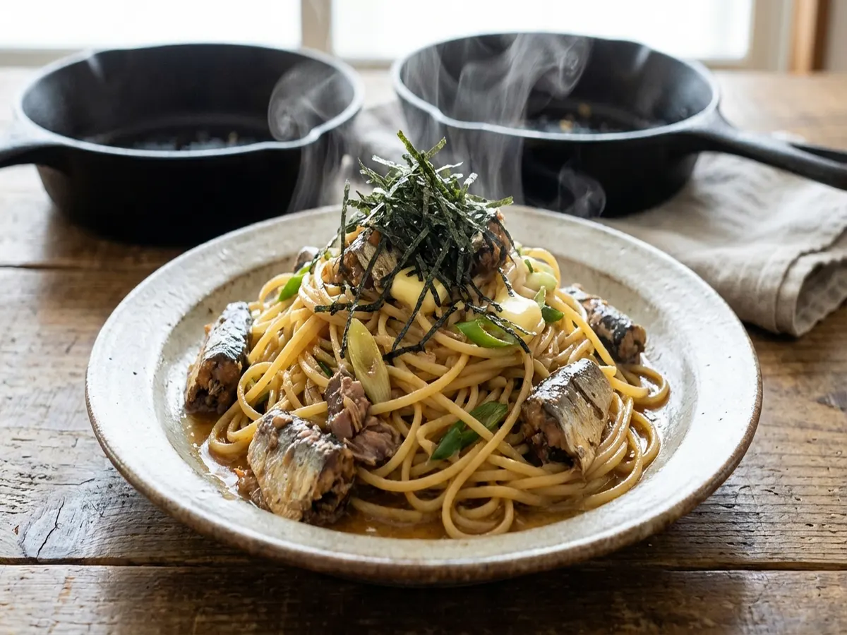 フライパン1つで作れるイワシのしょうゆ煮パスタのレシピを教えてくれました。
