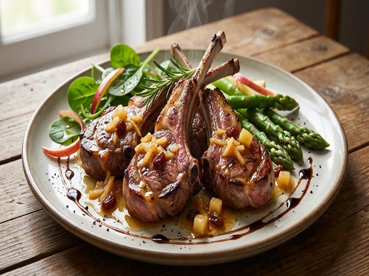 • 皿に塩茹でしたグリーンアスパラガス、細切りしたりんごの皮、オリーブ油と塩を和えたベビーリーフを飾り、ラムチョップを盛り、アップルソースをかける