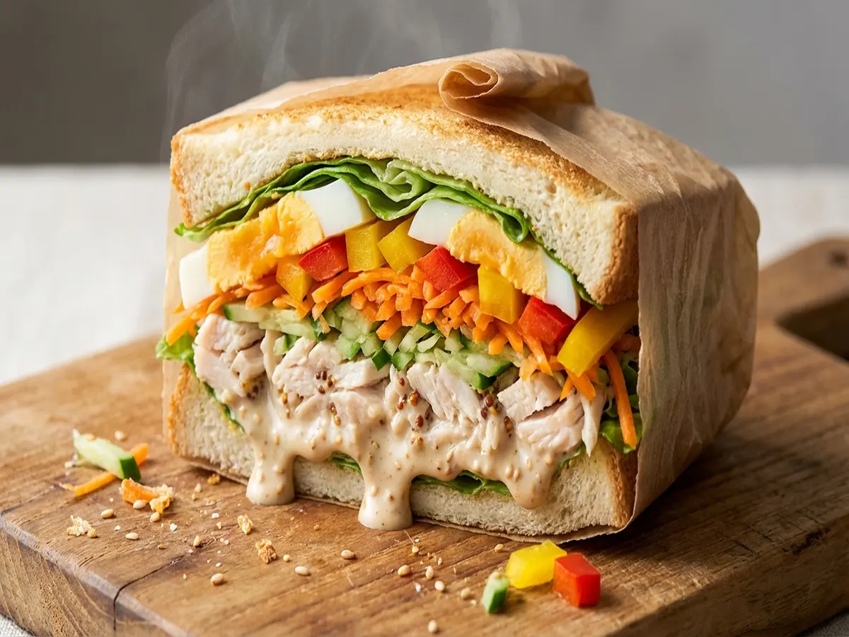 • 食パンにマヨネーズを塗り、ゆで卵、塩コショウ、サラダチキン、にんじん、きゅうり、パプリカなどの具材を重ねる