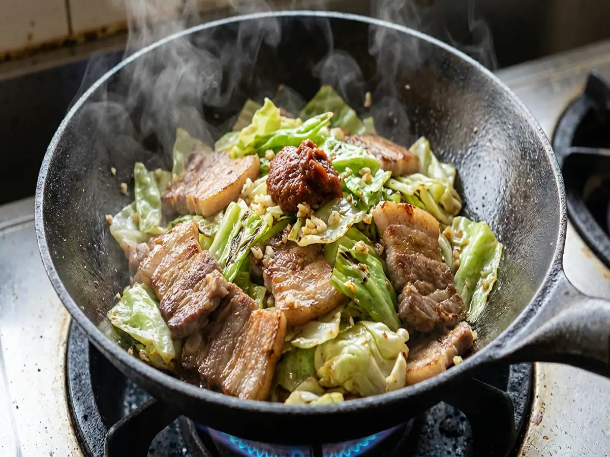 - キャベツ・にんにくを入れ、強めの中火で1分30秒ほど炒める。