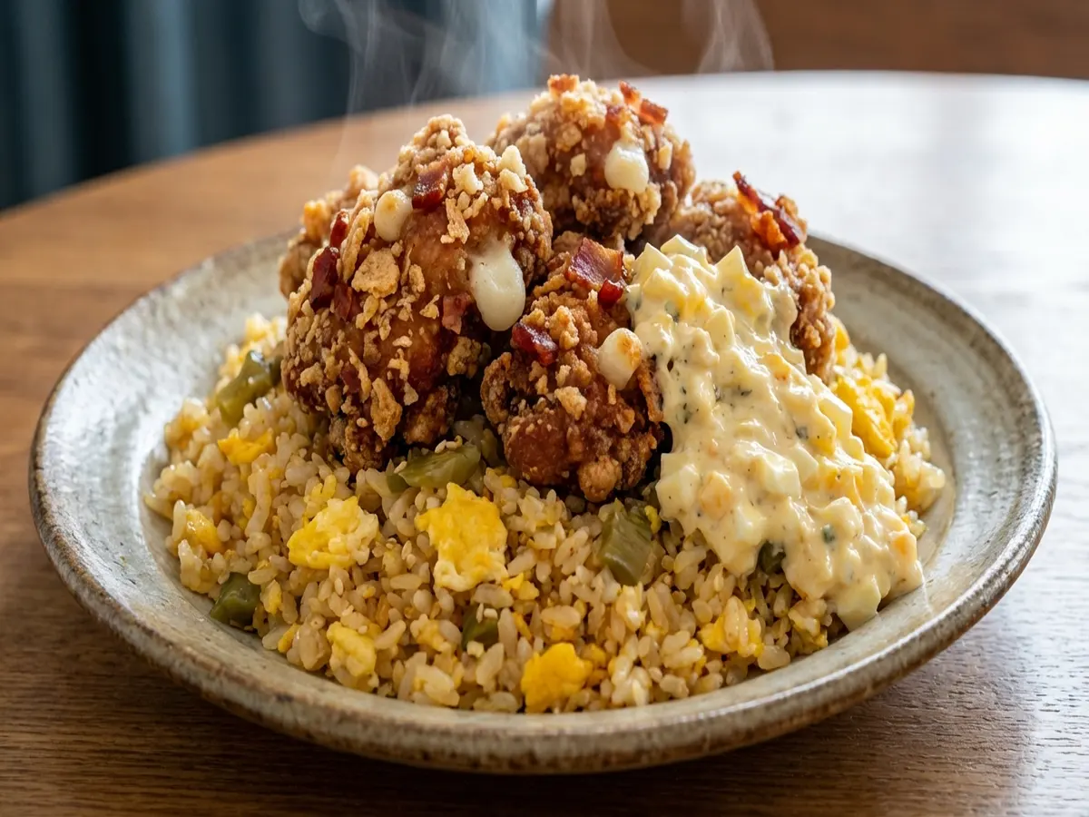 - 皿にチャーハン、唐揚げ、タルタルソース(ゆで卵+マヨネーズ)を盛ったら完成