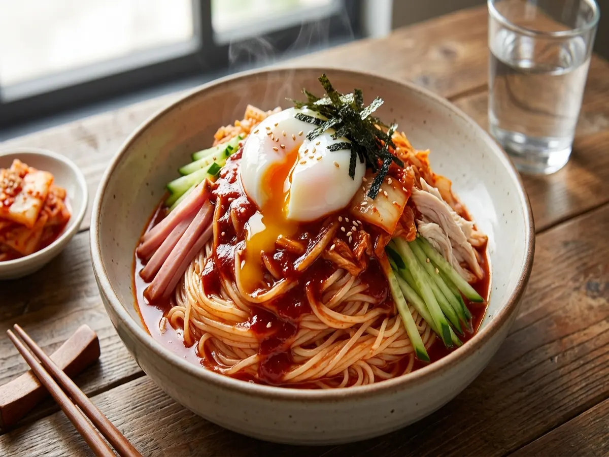 - ボウルにタレの材料を入れて混ぜ合わせ、水気を切ったそうめん・具材・キムチを入れてよく混ぜる