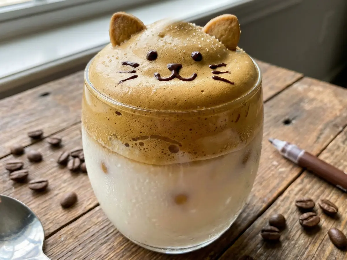 • チョコペンで顔を描いたら猫や犬のダルゴナコーヒー完成!クッキーで耳を作ってもOK