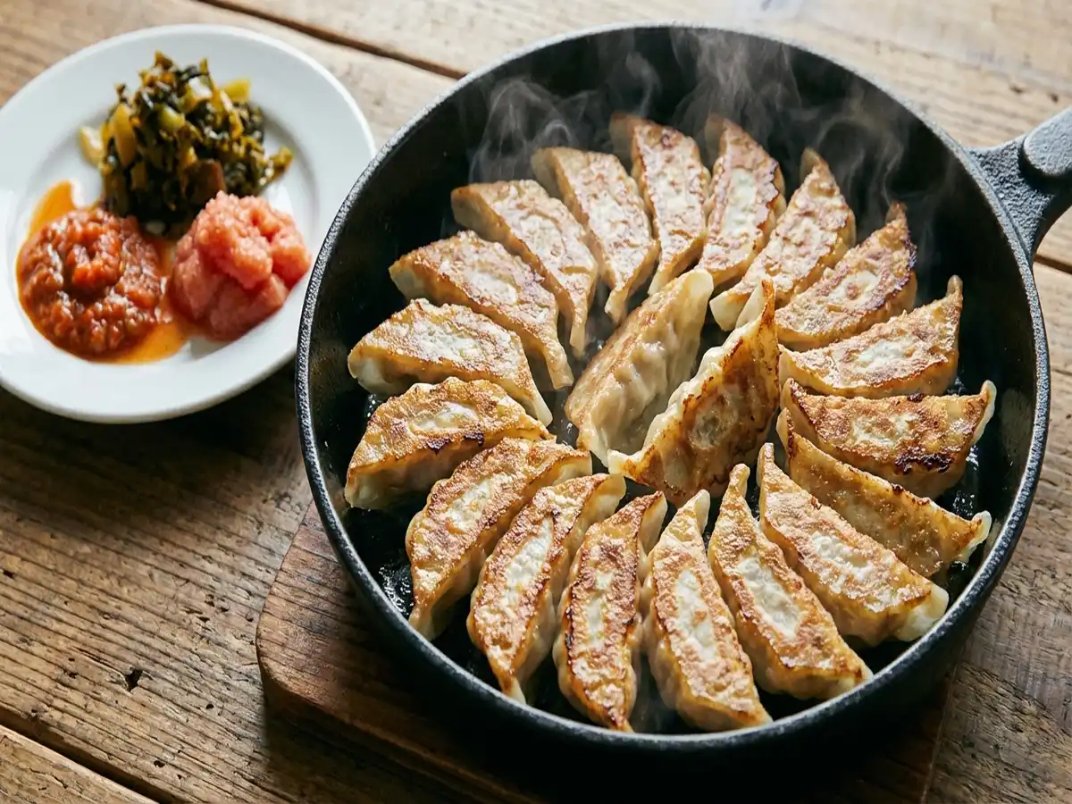 - 餃子を皿に移し、明太子・高菜・赤柚子胡椒を添える