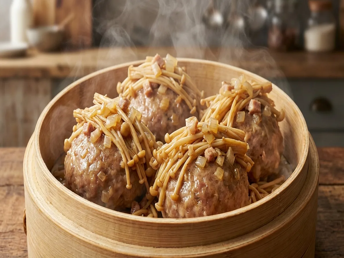 - 肉団子を作り、片栗粉をまぶしたえのきをまぶしてつける