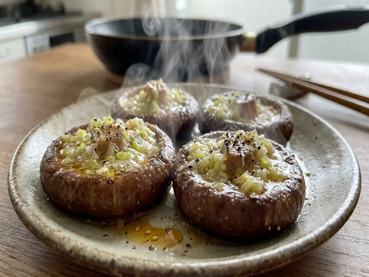 - 蒸し焼きにしたしいたけの上に2をのせ、フタをして40秒ほど蒸し焼きする