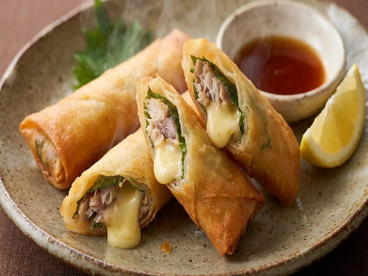- 皿に③のソースをひき、食べやすい大きさに切った春巻きをのせる