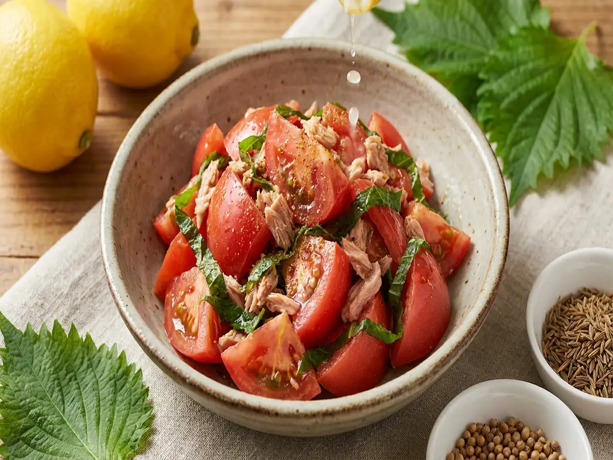 - ドレッシングをトマトにかけたら完成!