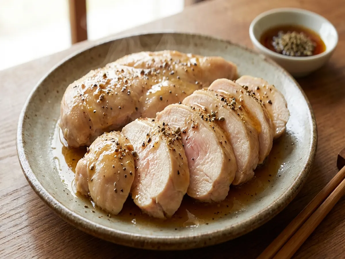 鶏もも肉VS鶏むね肉ライバル食材対決レシピ 長田知恵さんの「だし山椒のやみつき茹で鶏」の作り方です。