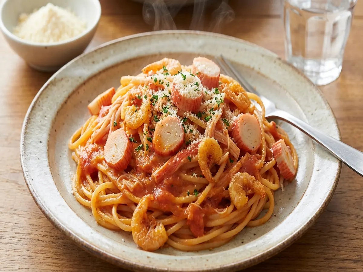 一流シェフの家飯 カニカマアレンジレシピ「カニかまぼこのトマトクリームパスタ」です。