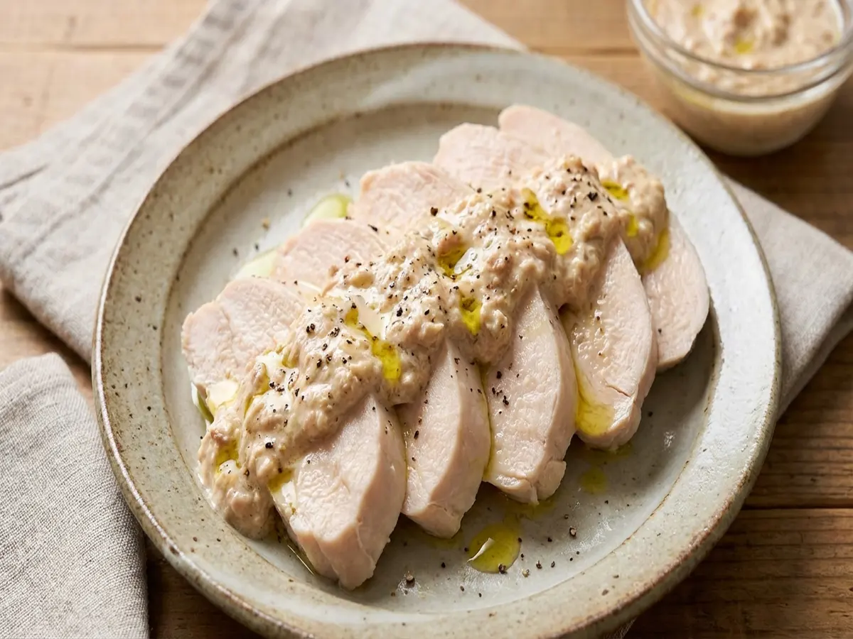 - 茹で上がった鶏むね肉の水分をふき取って皿に盛り、ツナのソース添えたら、オリーブオイル、黒コショウをお好みで振って完成!