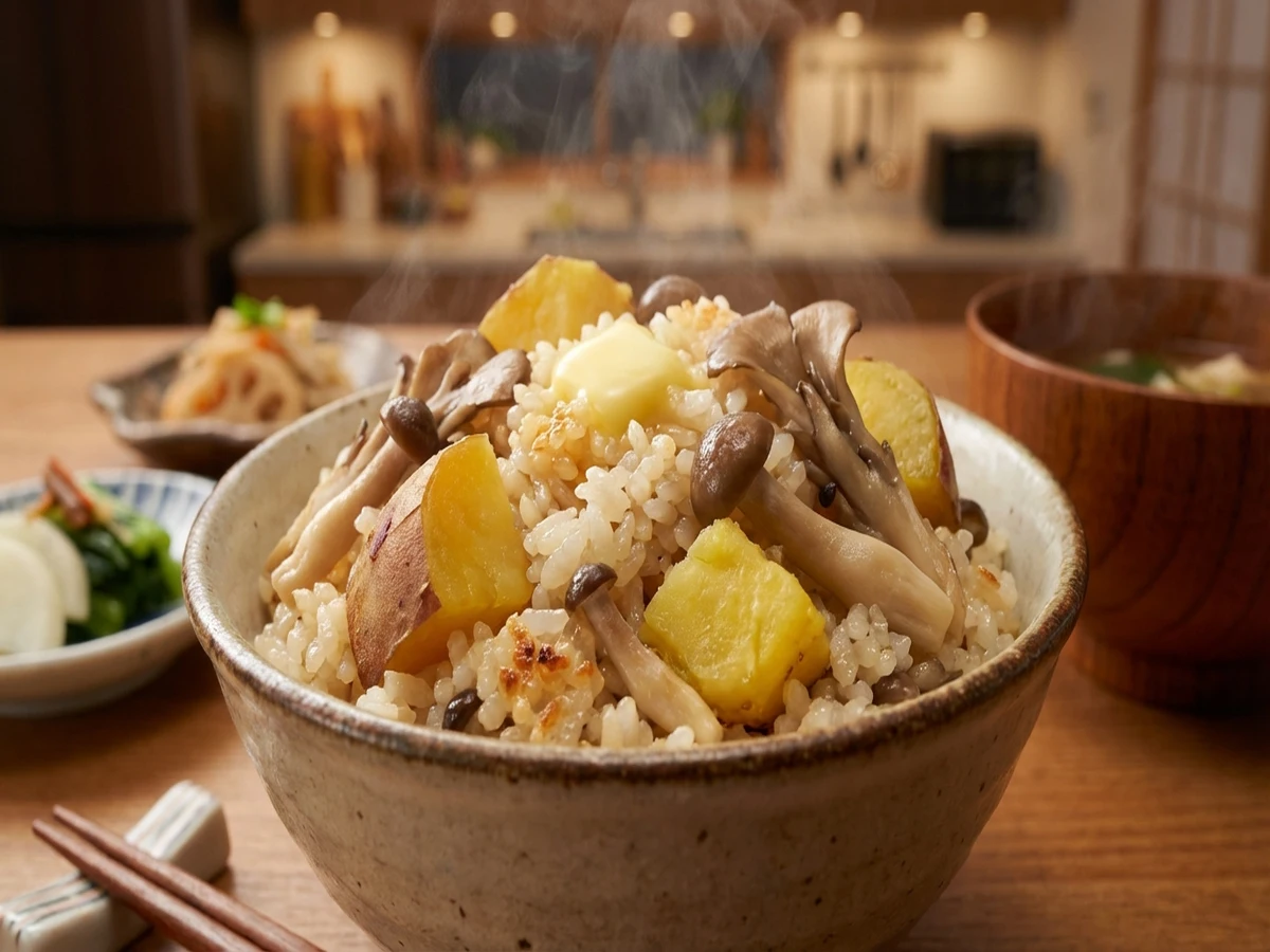 minutes旬の食材町クッキングの生産者直伝レシピ「安納芋とキノコの炊き込みご飯」です。