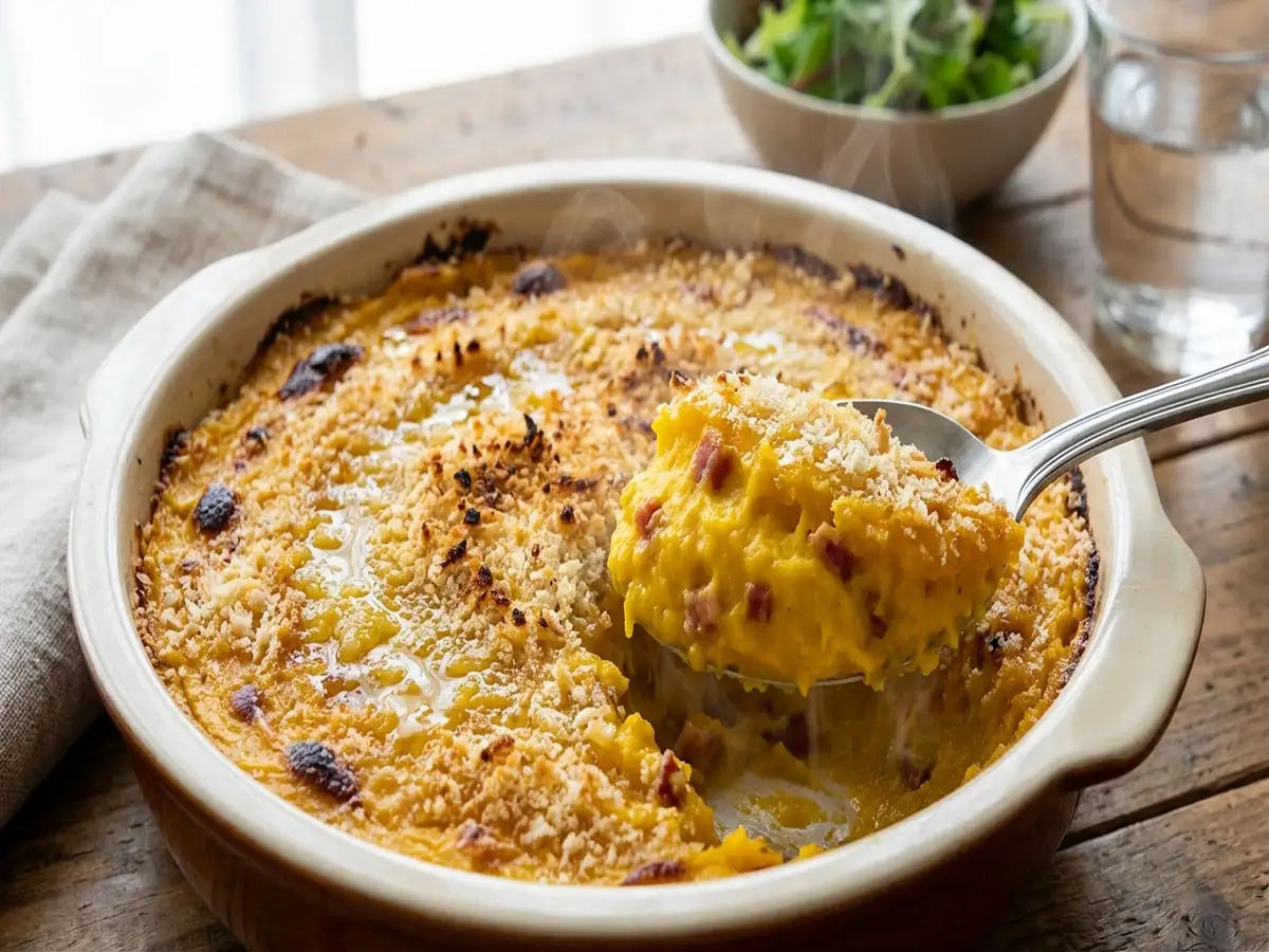 • かぼちゃの実をスプーンですくってベーコンとともにボウルに移す