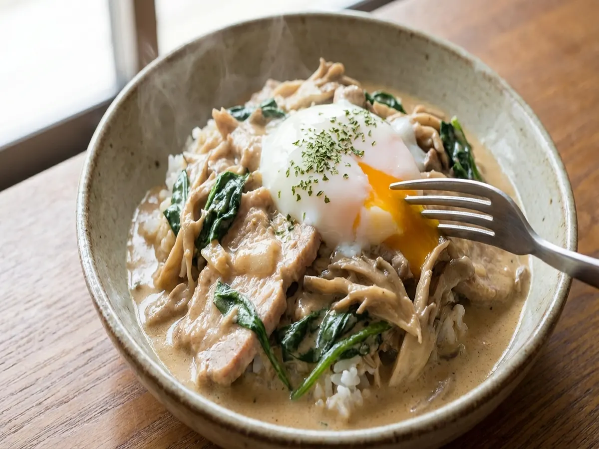• ご飯を器に盛り、6をかけ、温泉卵をトッピングし、乾燥パセリをふったら出来上がり!