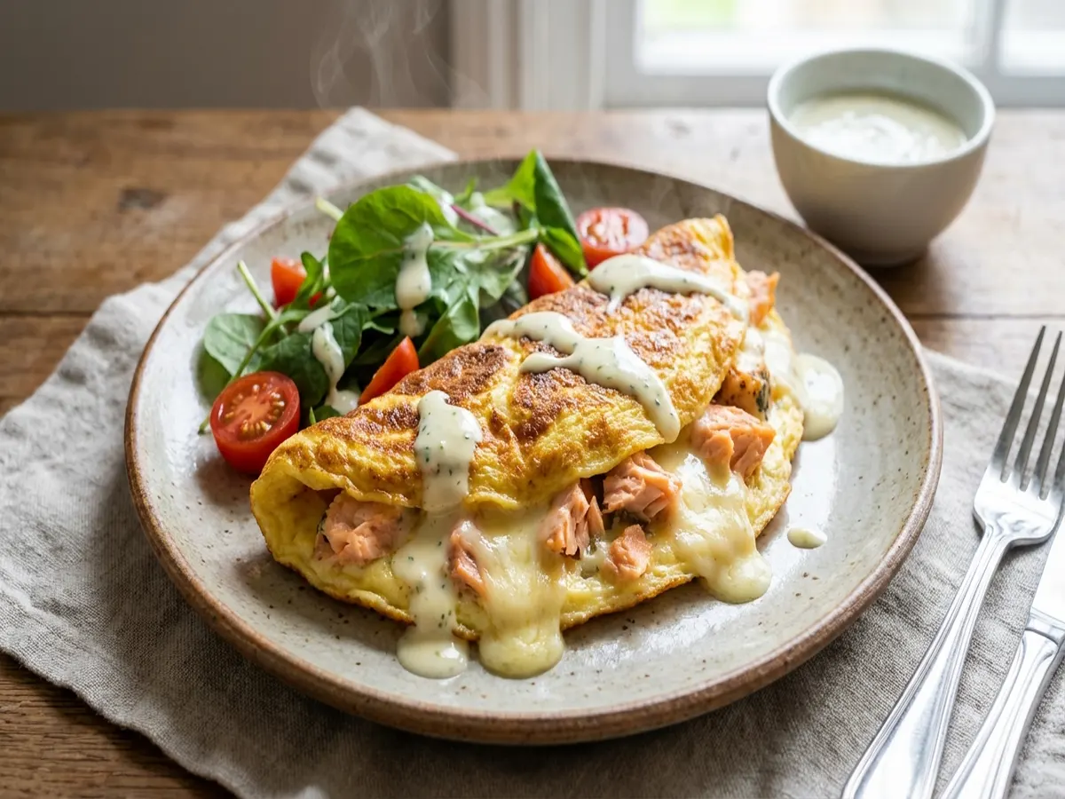 - 卵を半熟状に焼き、その上に2のサケとチーズを加えて、フライパンに蓋をしてチーズが溶けるまで加熱する。