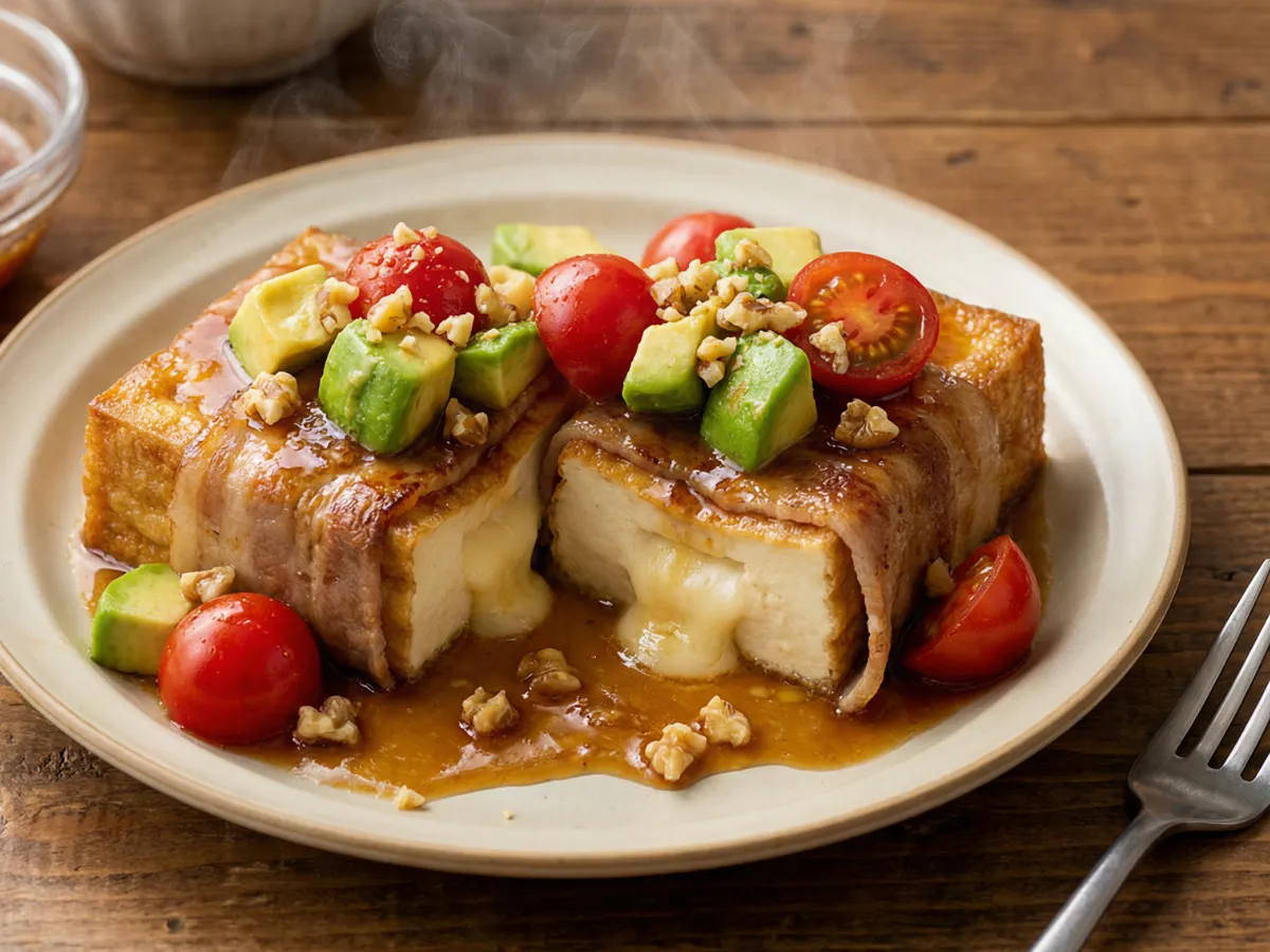 • 皿に厚揚げを盛り付け、上からフライパンのソース、アボカド、プチトマトをかけ、砕いたクルミ、お好みでエディブルフラワーを添えたら完成!