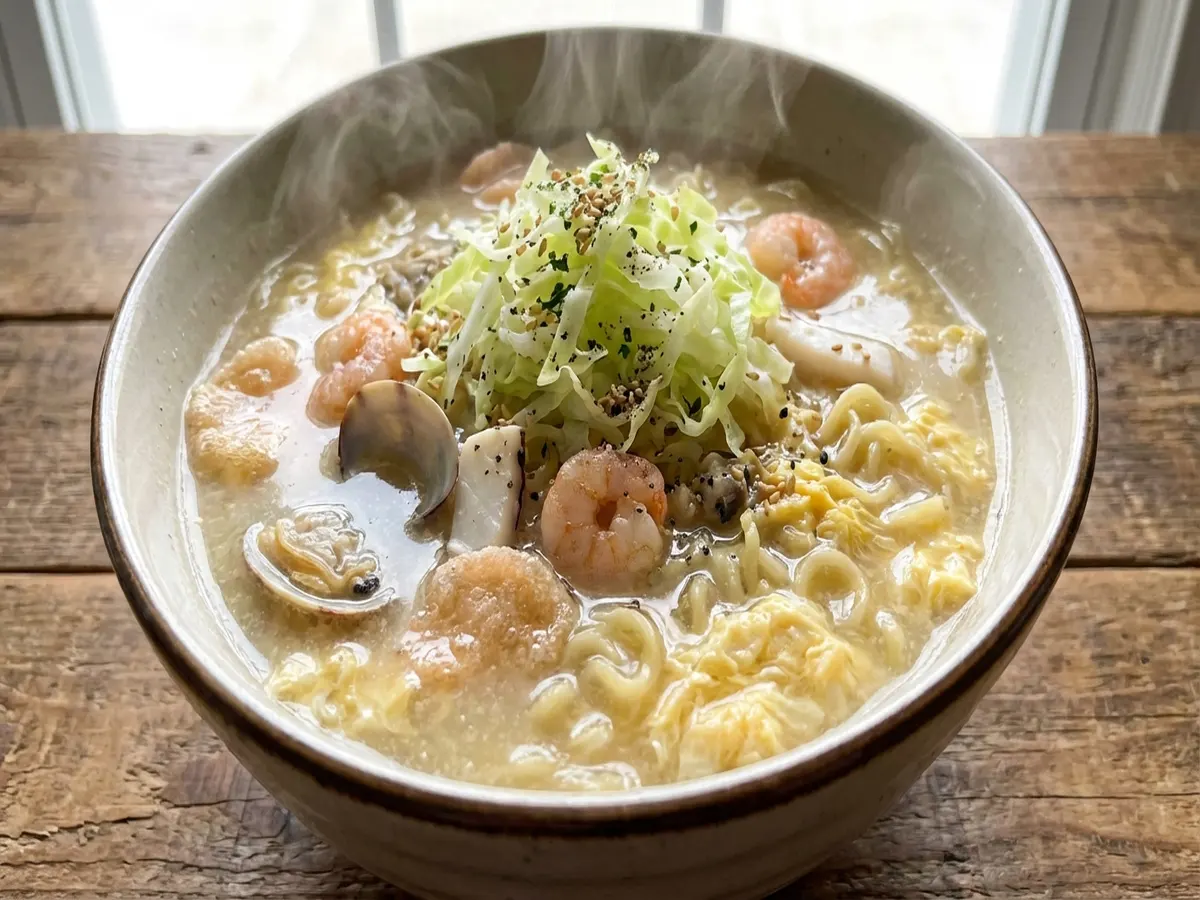 この記事では、らぁ麺すぎ本 サッポロ一番塩ラーメンアレンジレシピ「サッポロ一番極上シーフードラーメン」の作り方をまとめます。