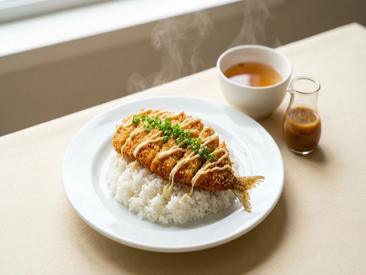 - タレをつけたアジフライを乗せ、ネギを散らす