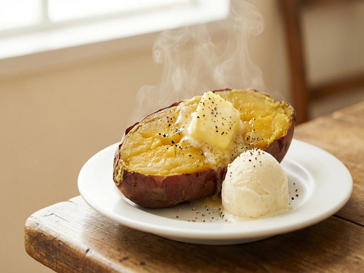 - 焼き芋を縦半分に切り、フォークで全体に穴をあける
