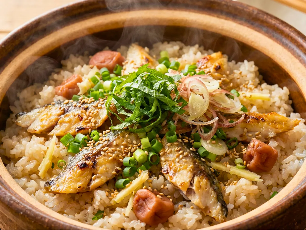 - 土鍋に水気を切った米、だしを入れ、アジ、梅干し、塩、生姜を入れて炊く