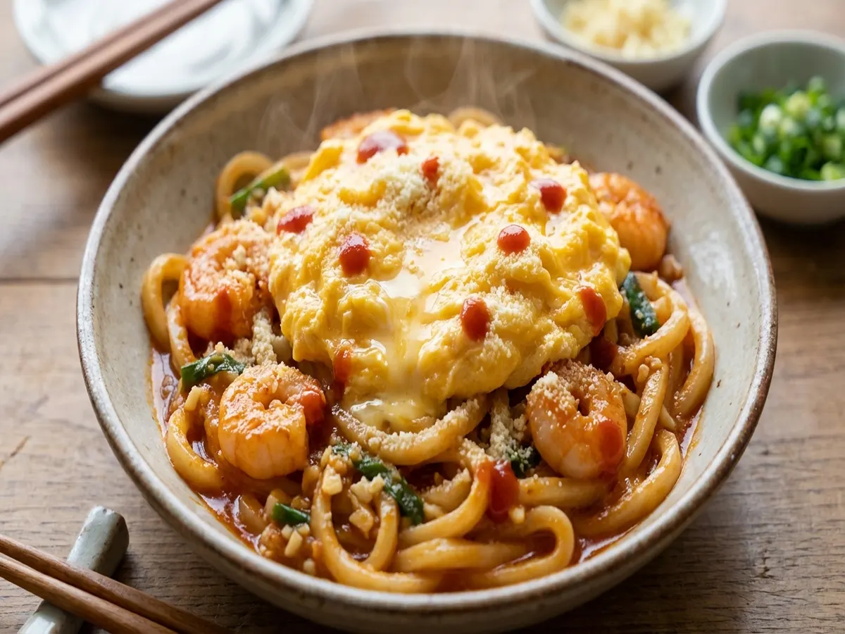- 皿にうどんを盛り、5のオムライスをのせる。お好みでタバスコ、粉チーズをかけた食べる。