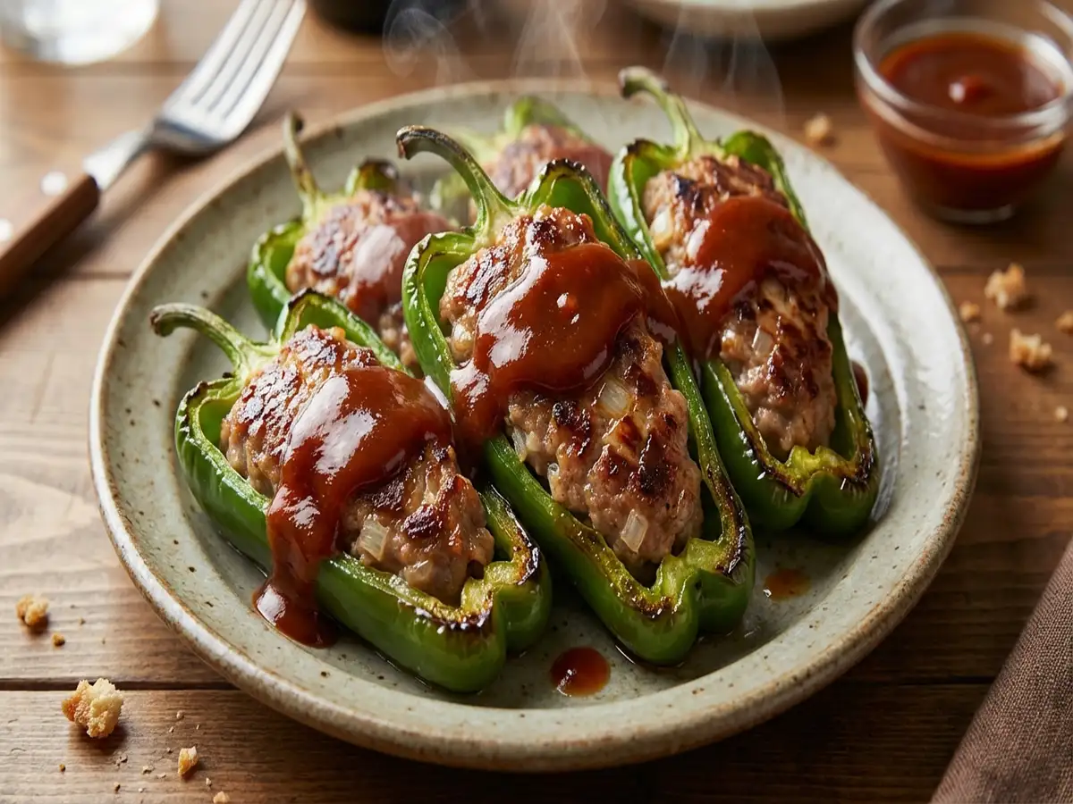 • ピーマンの肉詰めにソースをかけたら完成!