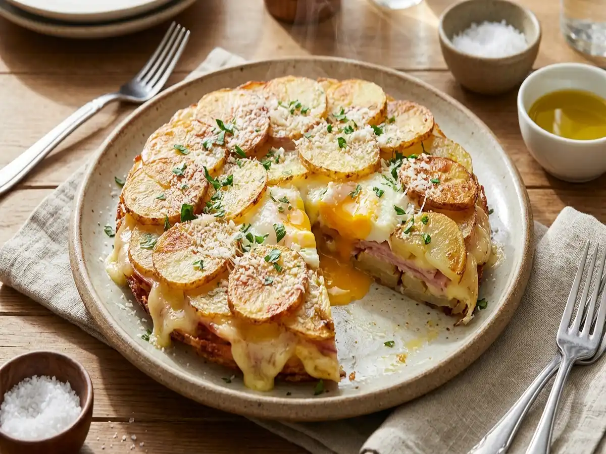 • 生卵をくぼみにのせ、残りのじゃがいもを上にかぶせて塩少々を振り、強めの中火で約10分ほど焼く