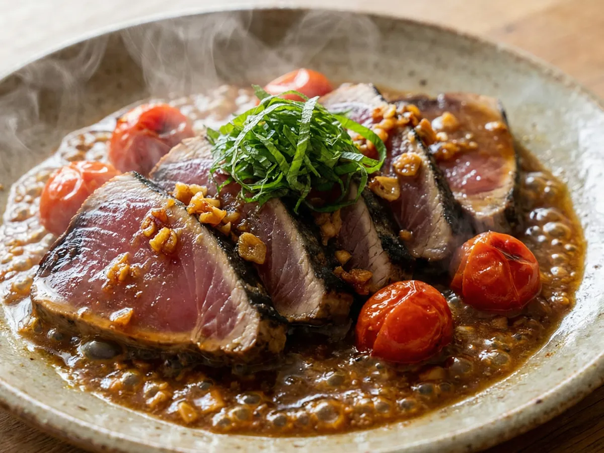 minutesゆるやせトリオ牛尾理恵さんのレシピ「かつおステーキガーリックミニトマトソース」です。