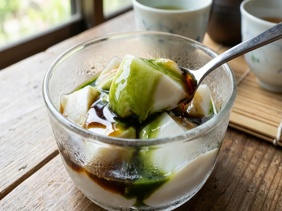 - 食べる直前にスプーンですくって器に盛り、お好みで抹茶シロップ、ほうじ茶シロップをかける。