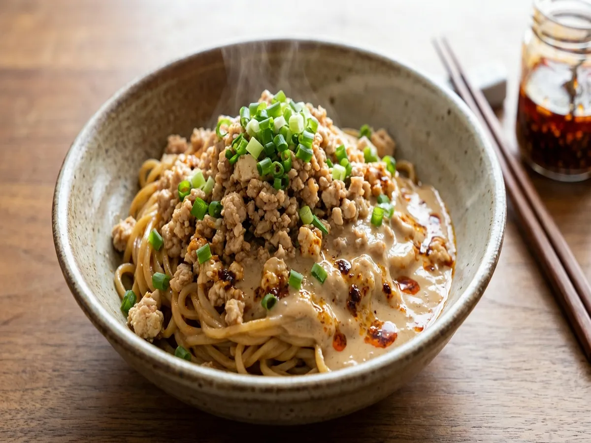 - ごま豆腐ダレとラー油をかけ細ねぎを散らす。