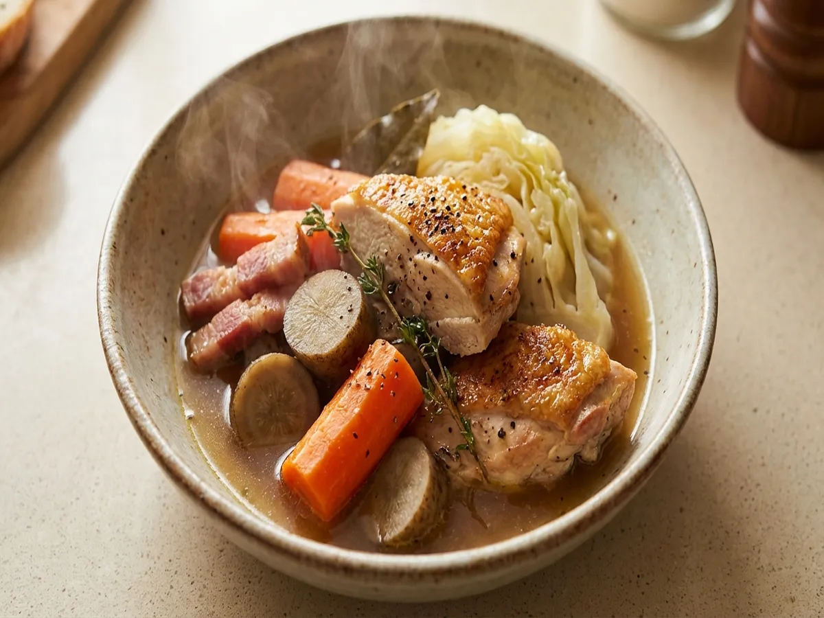★Point 野菜は堅いものから順に重ね、火を均一に通す。 - 【A】を加え(固形スープの素は埋めるように入れる)、鶏肉、ベーコンをのせ、あればハーブをのせる。ふたをして中火にかけ、沸いたら弱火にして30分間煮る。