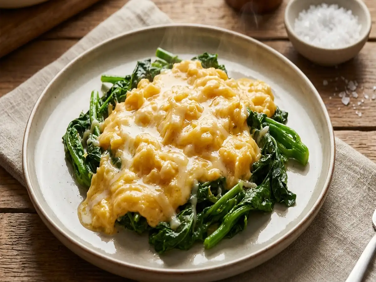 - 【卵ソース】をつくる。ボウルに卵を割り入れて溶きほぐし、残りの材料を加えて混ぜ合わせる。フライパンに移して弱火にかけ、耐熱のへらで常に混ぜながら3~4分間煮る。トロトロになったら火を止め、1にかければ完成!(フライパンの底や縁のソースが固まってくるので、こそげるようにして混ぜ続ける。)