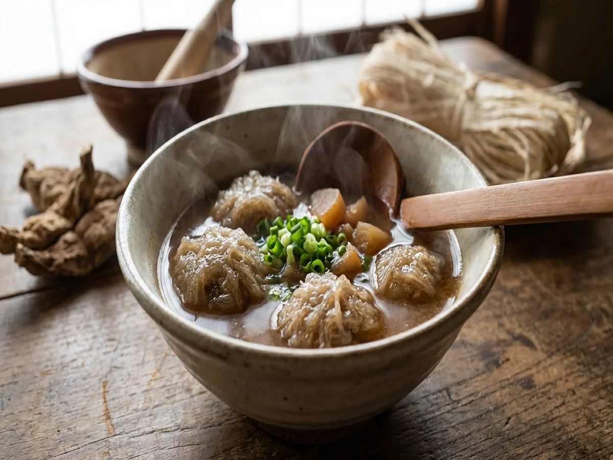 - 葛粉・味噌汁と混ぜ、こねて団子状にする