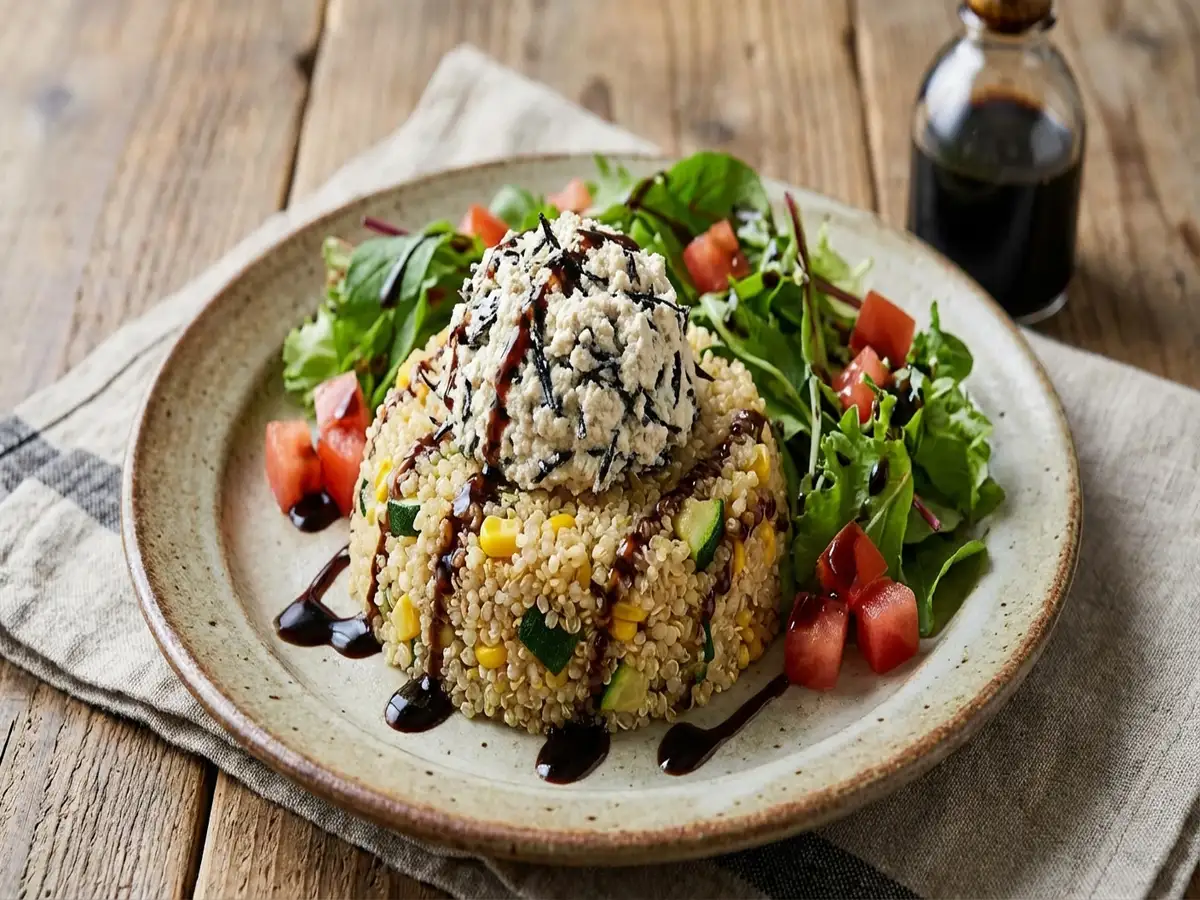 - 煮たキヌアを皿に盛り、豆腐チーズをのせ、サラダミックスとトマトを飾る。バルサミコソースをかけたら完成