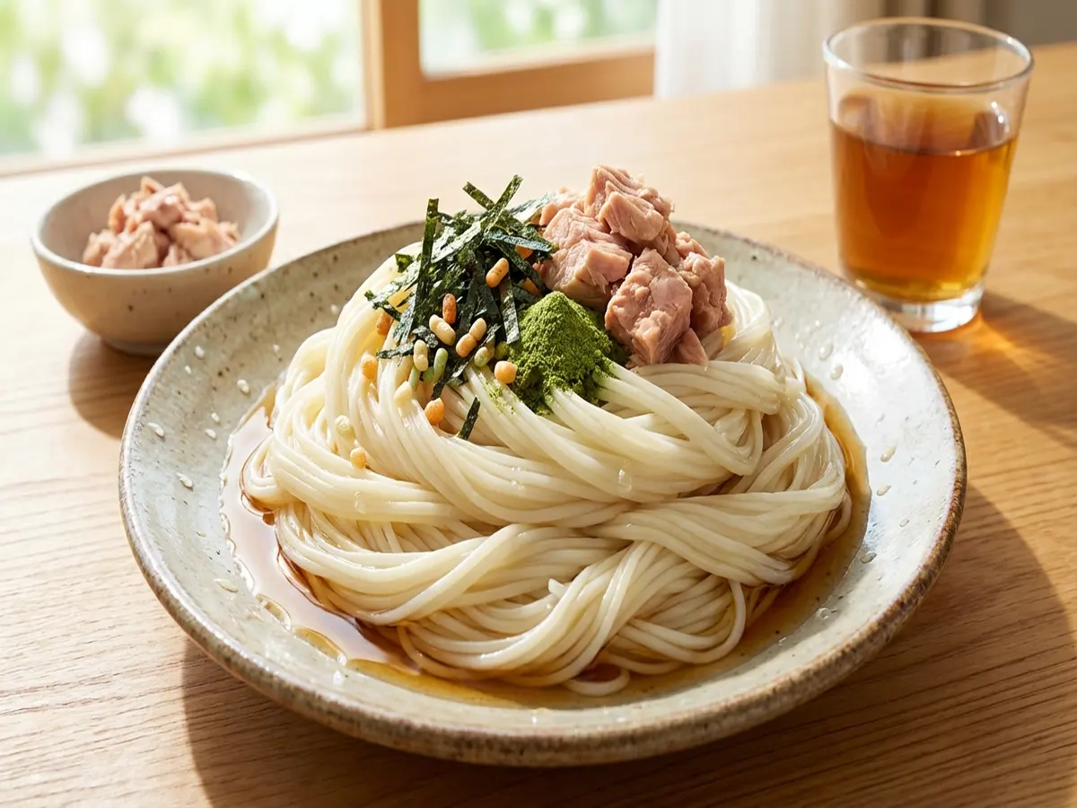 - めんつゆ(表示濃縮の水で割る)を注ぎ、ツナ缶をたっぷりのせる