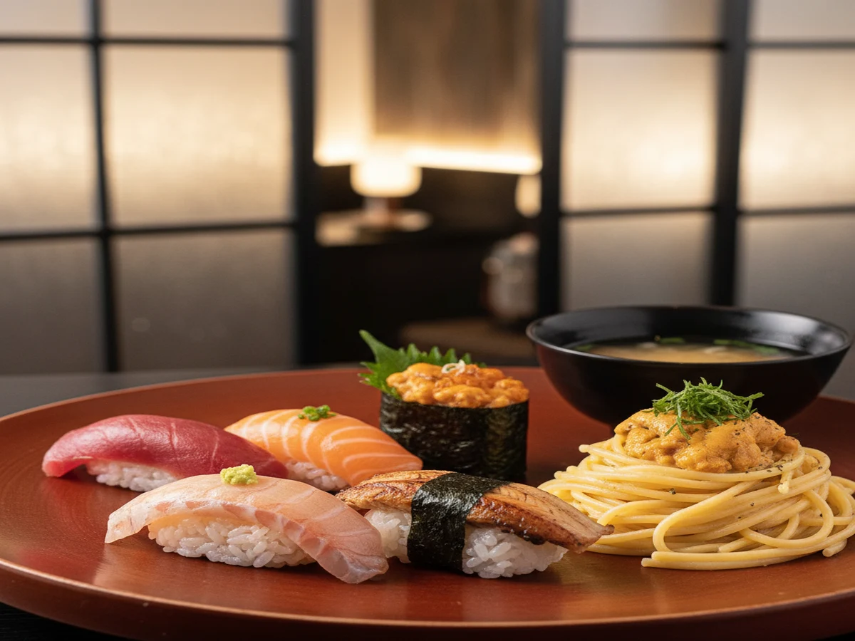 寿司とパスタのリアル二刀流店主が登場し、貝柱のポルチーニクリーム他、本格パスタ付きお寿司セットが驚きの価格!