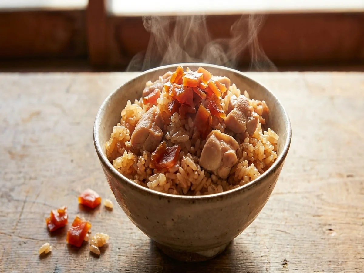 - 炊飯器に米、水、鶏肉、福神漬の汁を入れて炊飯する