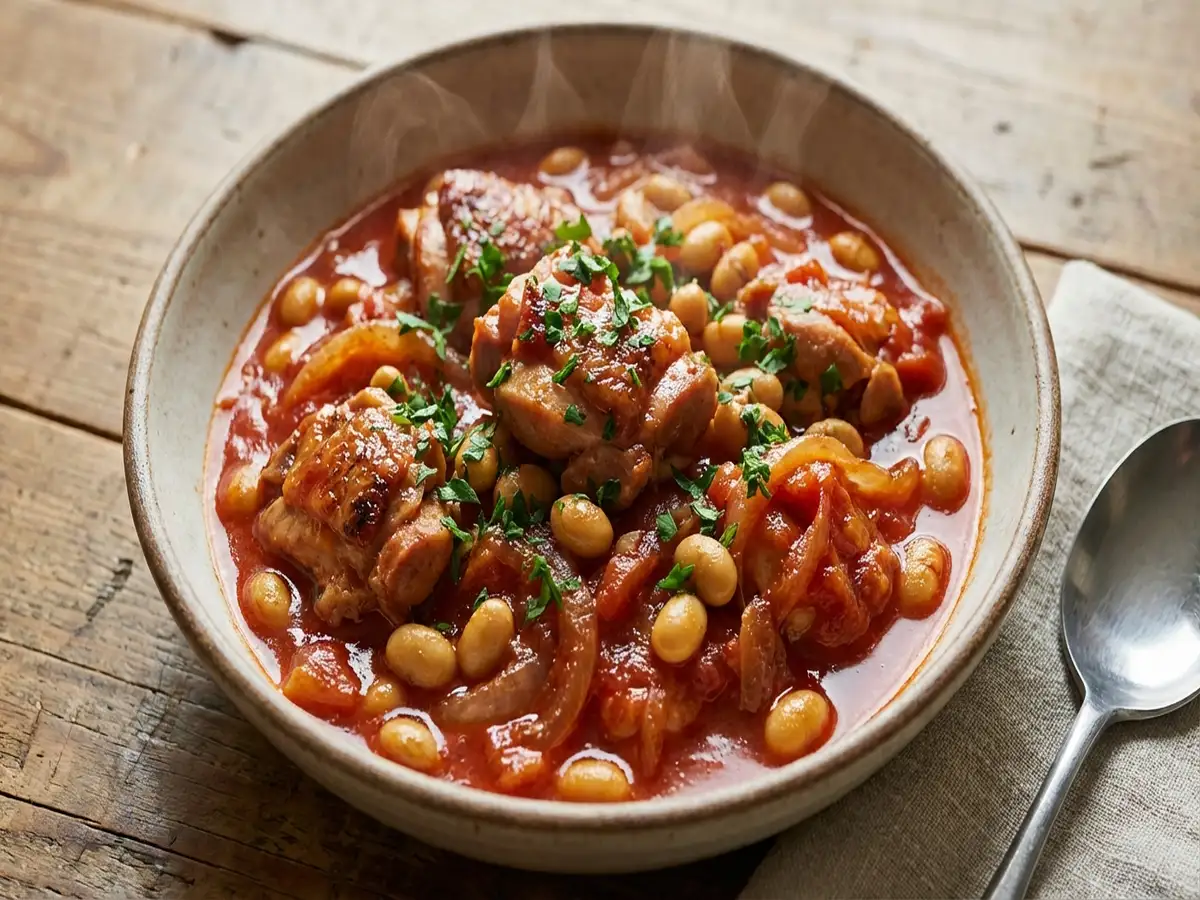 • 鶏肉と大豆の水煮をトマトで煮た、チキンのトマト煮。